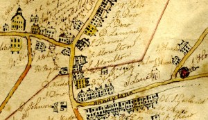 This rustic, color-coded map by an unknown maker was found in the North Hampton Library and donated to the Hampton Historical Society in 2008. The linen backing suggests that it may have been used as a wall map. Besides depicting the principal buildings and the names and locations of property owners, it identifies two roads by their names then in use, Sandy Lane (Winnacunnet Road) and Nook Lane (the eastern end of High Street).
