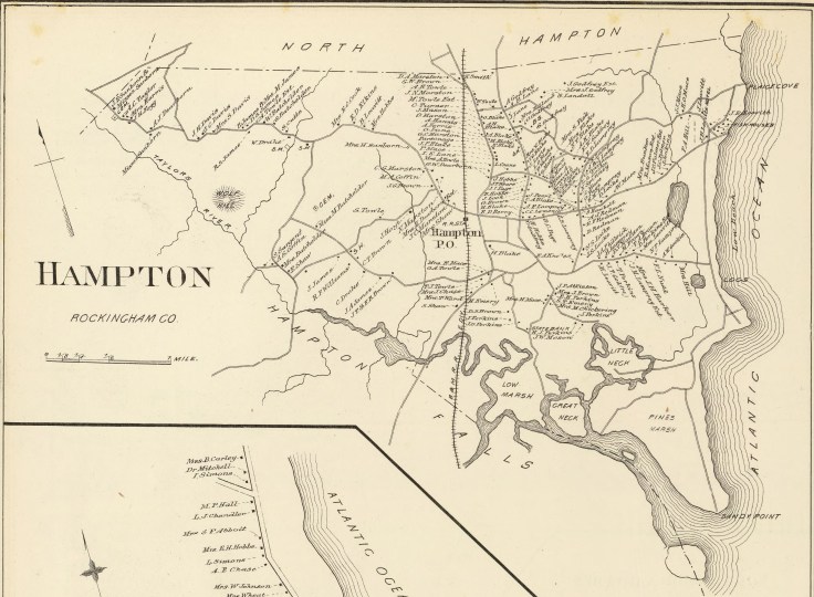From his publishing offices in Boston, Massachusetts, historian Duane Hamilton Hurd produced dozens of works on the histories of New York and New England, including the illustrated 1882 History of Rockingham and Strafford Counties. Maps of Hampton and Hampton Beach appear in Hurd’s 1892 Town and City Atlas of the State of New Hampshire, which is the last privately published map of this type to mark Hampton residents’ names and property locations.